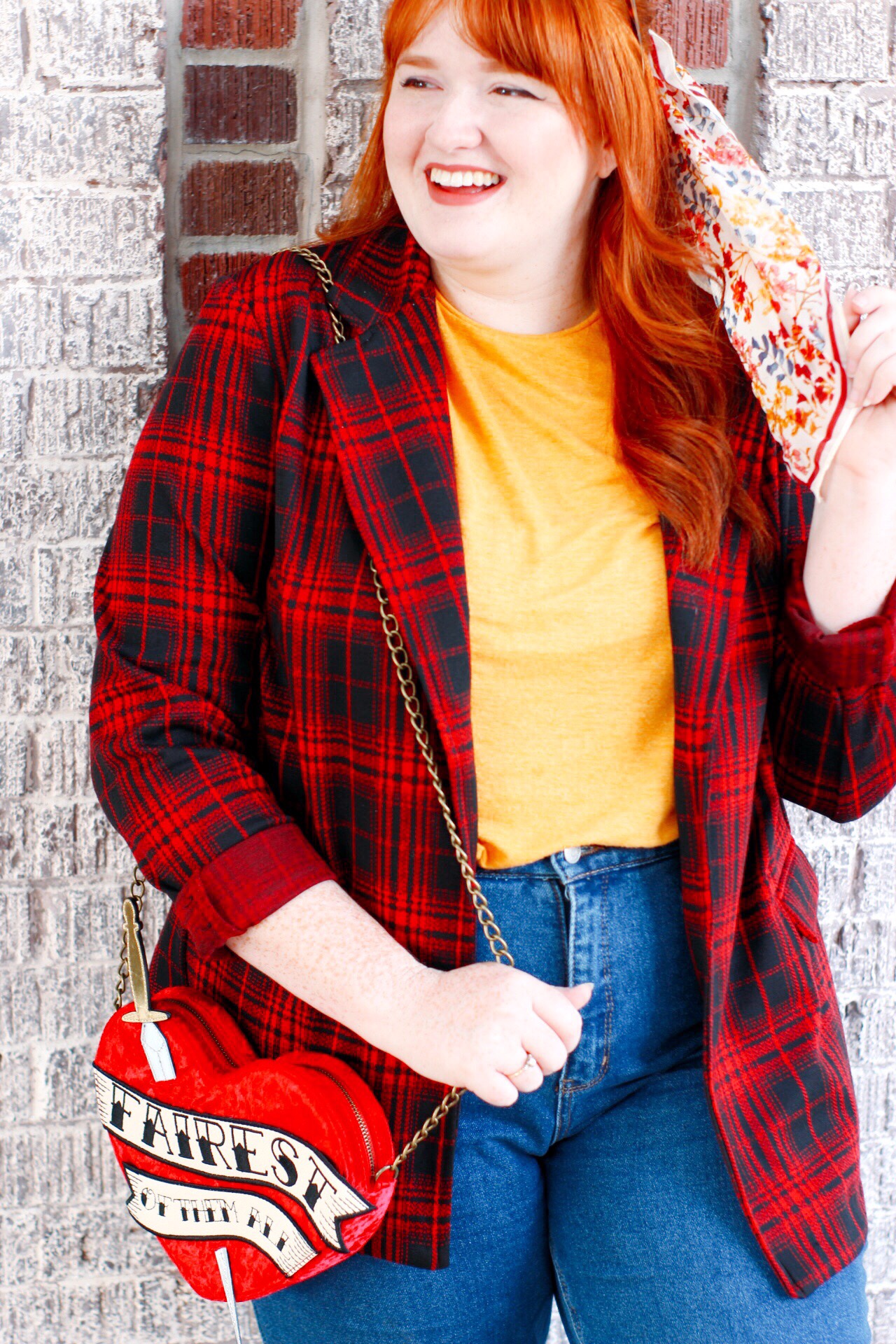 This is my most favorite outfit I put together for this series and it all stems from this plaid blazer! Comfortable and super versatile, it is perfect for all seasons and can easily swap from business to casual. Although it was a little daunting at first, I loved mixing these two bright colors together easily pulling inspiration from Snow White’s dress, mingle in the blue hues of my denim jeans and the most charming “Fairest of them all” cross body bag and I feel like I can take on the whole world! Or maybe just an Evil Queen and her Huntsman.