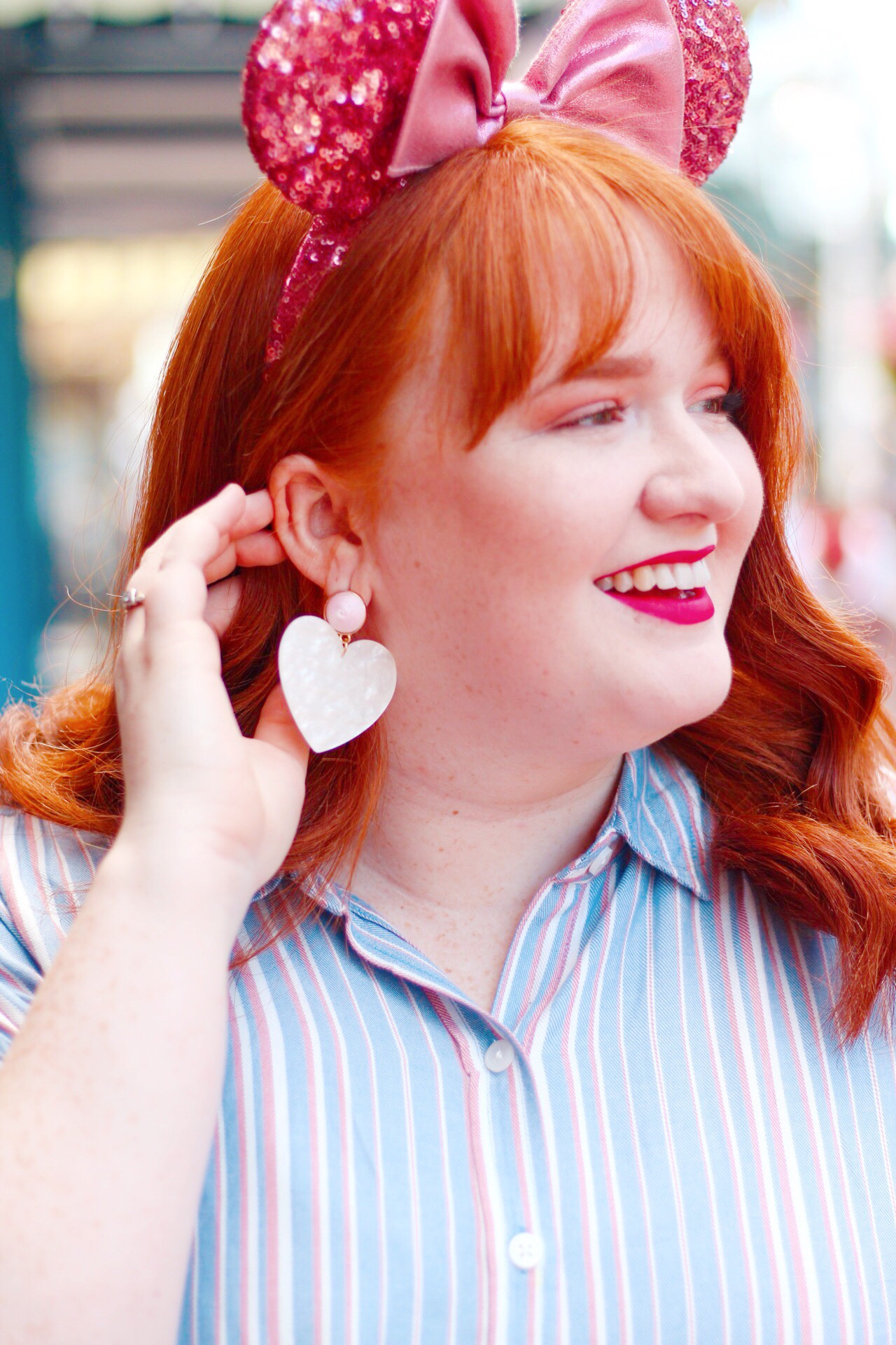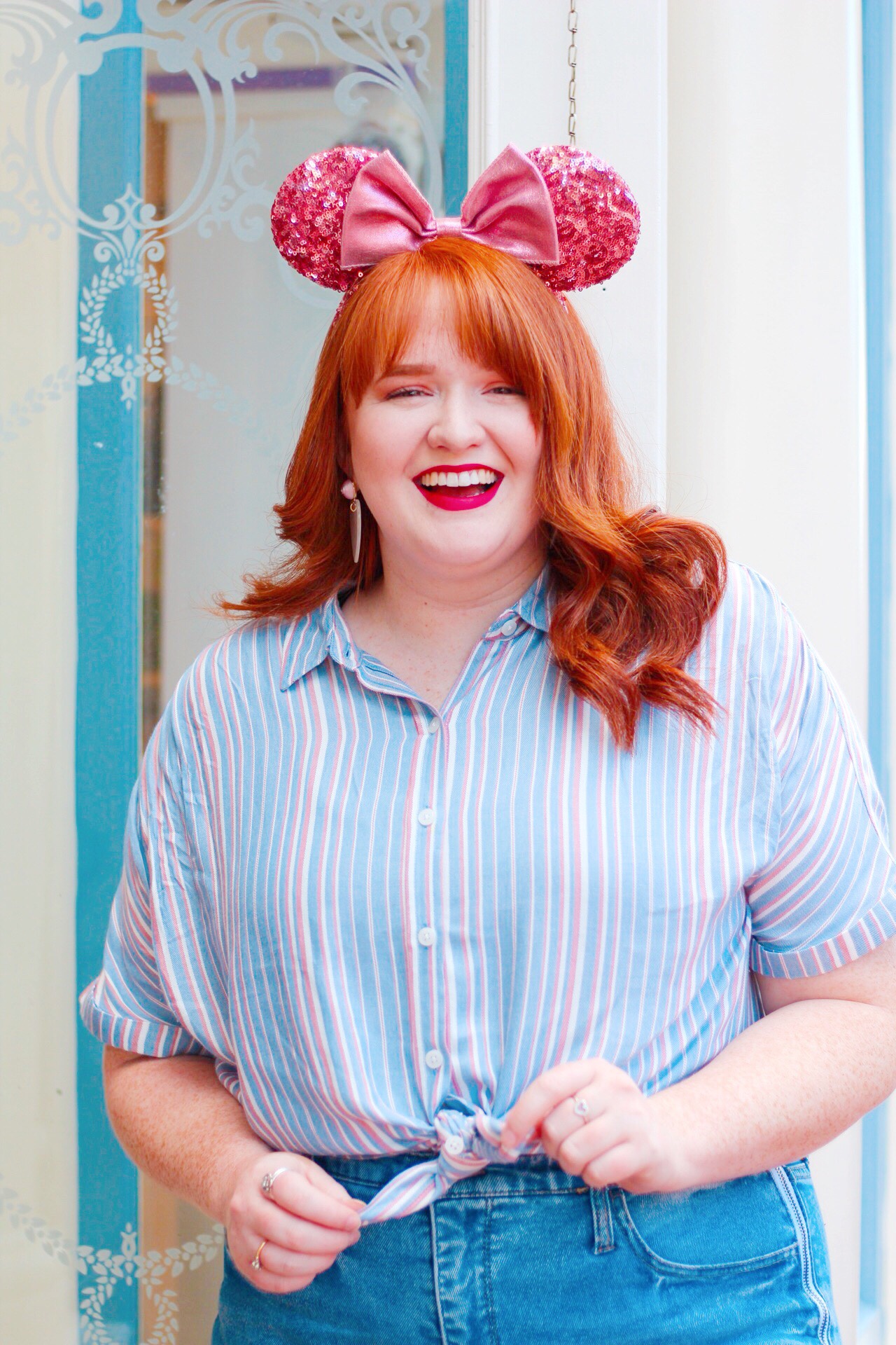 Stripes make me happy especially when they come in a button down that is super versatile and on one of my most favorite pieces of clothing I own right now! Going along with the pink theme, I picked this top from Target because it was extra comfortable, soft, and I loved the mixing of the blue and pink hues together. I decided to tie up the top which I thought accentuated my waist and was a little more feminine of a way to wear this type of blouse. I was lucky enough to grab the last pair of these whimsical heart earrings they had in the store, which became an excellent accessory. I thought these earrings really complimented the ears and pulled together the entire outfit, pretty much the cherry on top! Add my Shellie May backpack from Tokyo Disney, my favorite pair of jeans and some yellow Vans and you’ve got an outfit that will make you feel beautiful and confident!