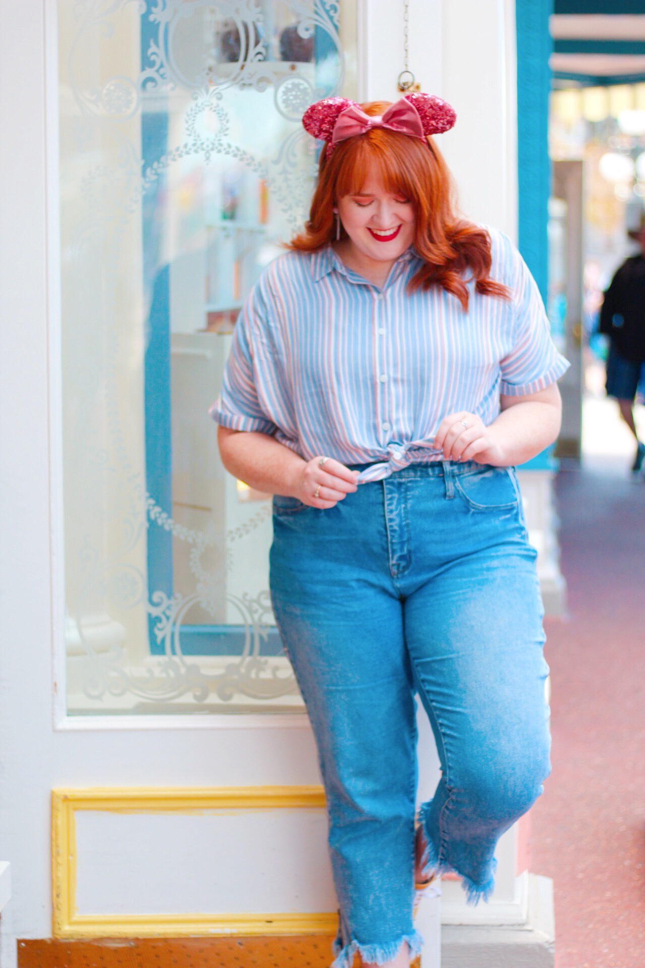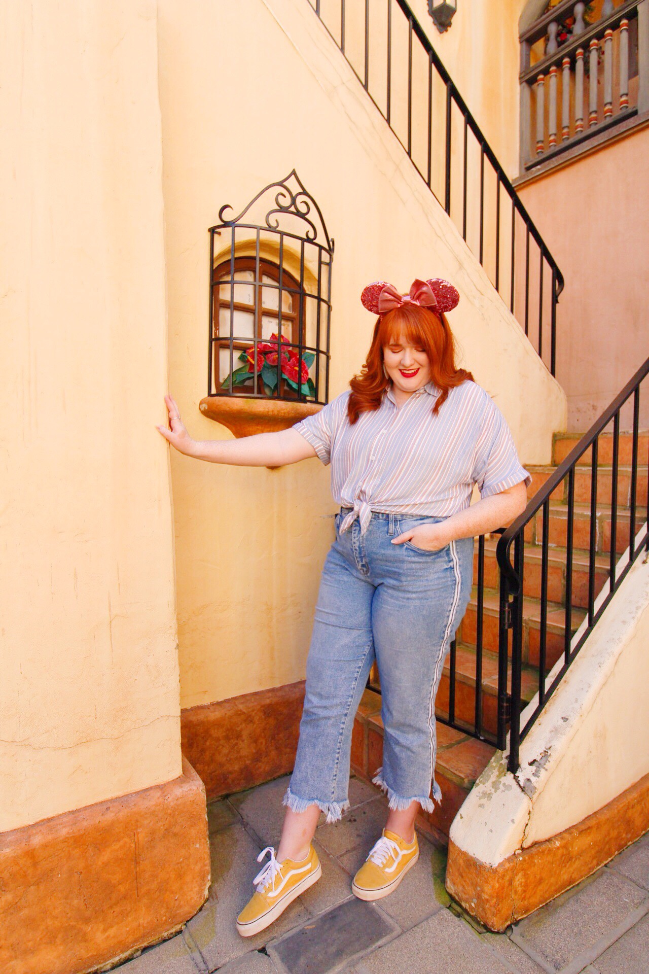 Stripes make me happy especially when they come in a button down that is super versatile and on one of my most favorite pieces of clothing I own right now! Going along with the pink theme, I picked this top from Target because it was extra comfortable, soft, and I loved the mixing of the blue and pink hues together. I decided to tie up the top which I thought accentuated my waist and was a little more feminine of a way to wear this type of blouse. I was lucky enough to grab the last pair of these whimsical heart earrings they had in the store, which became an excellent accessory. I thought these earrings really complimented the ears and pulled together the entire outfit, pretty much the cherry on top! Add my Shellie May backpack from Tokyo Disney, my favorite pair of jeans and some yellow Vans and you’ve got an outfit that will make you feel beautiful and confident!